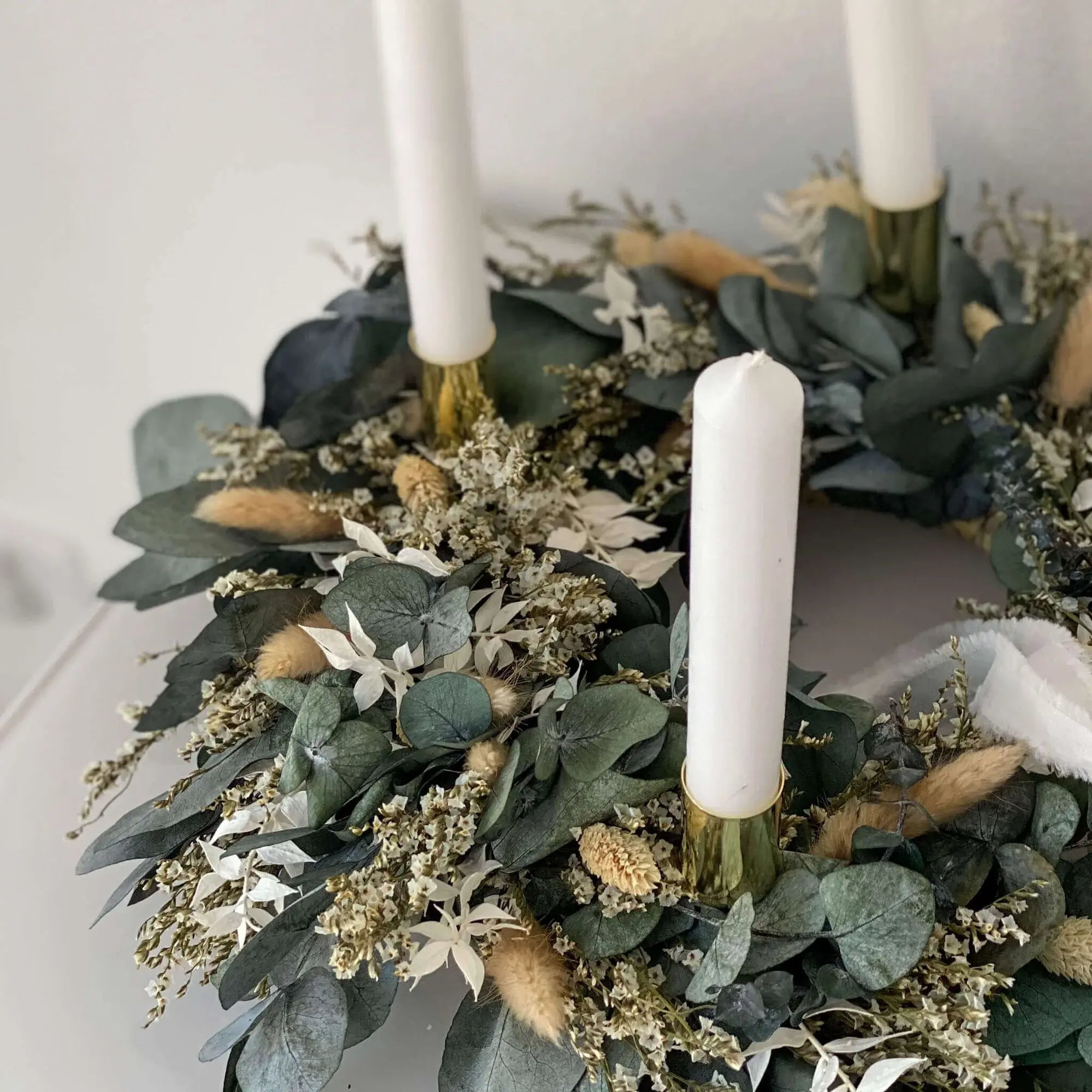 Unsere handgefertigten Adventskränze aus Trockenblumen vereinen traditionelle Weihnachtsstimmung mit modernem Design. Jeder Kranz ist ein Unikat und kann auf Wunsch mit passenden Stabkerzen ergänzt werden – wahlweise in klassischen Rottönen oder modernen Pastellfarben. So wird dein Kranz zum stilvollen Highlight auf jedem Tisch.