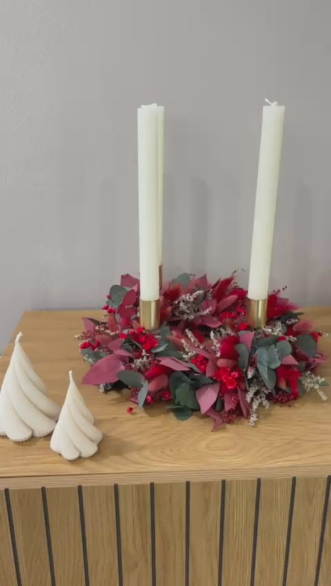 Ein Adventskranz voller Charakter: Leuchtendes Rot trifft auf sattes Eukalyptusgrün und schafft eine moderne, warme Weihnachtsstimmung.