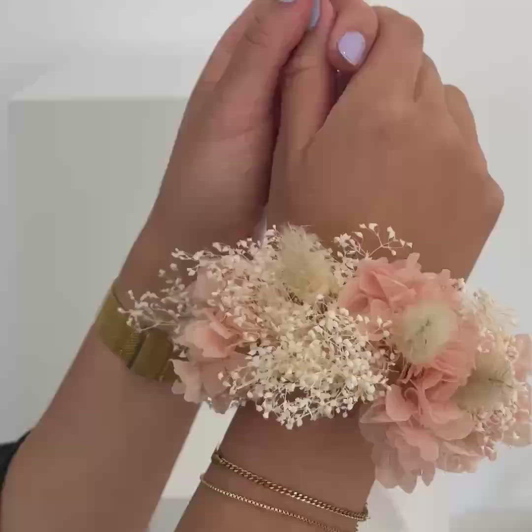 The bracelet made of dried flowers is a great addition to our pink pampas grass bridal bouquet for the maid of honor or bridesmaids. The delicate dried flowers in white are beautifully summery for a casual wedding or JGA with dried flowers. The opulent bracelet with dried flowers made from hydrangeas and daisies is also perfect for flower girls or as a bracelet for communion or confirmation