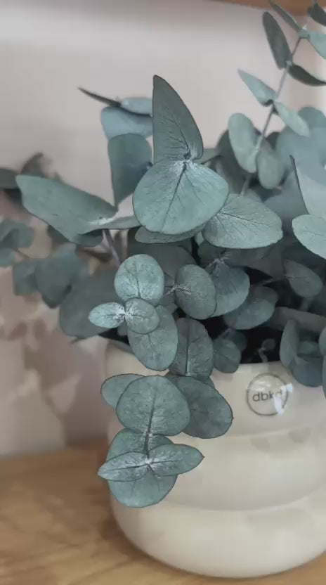 Ein Stück Natur, das bleibt! Dieses minimalistische Trockenblumengesteck aus zartem Eukalyptus Cineria kommt im eleganten Blumentopf von dbkd – perfekt für alle, die keinen grünen Daumen haben, aber trotzdem stilvolle Deko lieben.