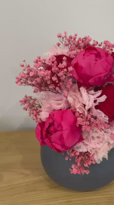 Pink LOVE ist ein leuchtender Brautstrauß voller Ausdruck und Gefühl. Intensive Pink- und Rottöne treffen auf eine harmonische Komposition aus konservierten und getrockneten englischen Rosen, Pfingstrosen, Hortensien und feinem Schleierkraut. Üppig, romantisch und dennoch modern setzt dieser Strauß ein starkes Statement.