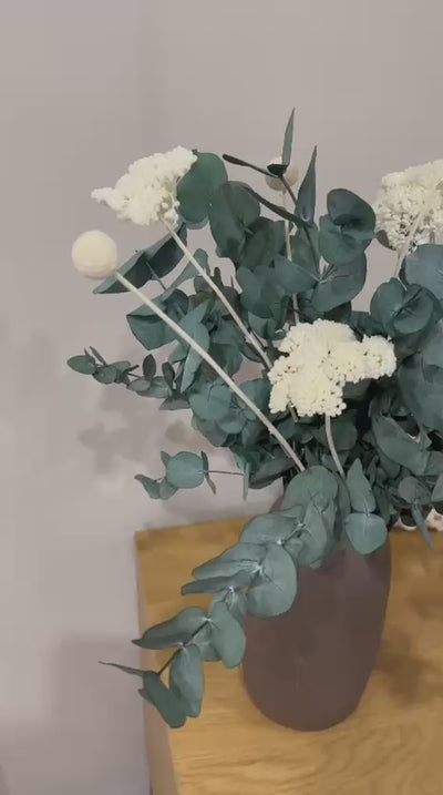 Bringen Sie frischen Wind in Ihr Zuhause mit unserem bezaubernden Trockenblumenstrauß „Pop of Colour“. Dieser einzigartige Strauß kombiniert die sanften, eleganten Töne von Eukalyptus mit den cleanen, weißen Craspedia und der zarten Schafgarbe.