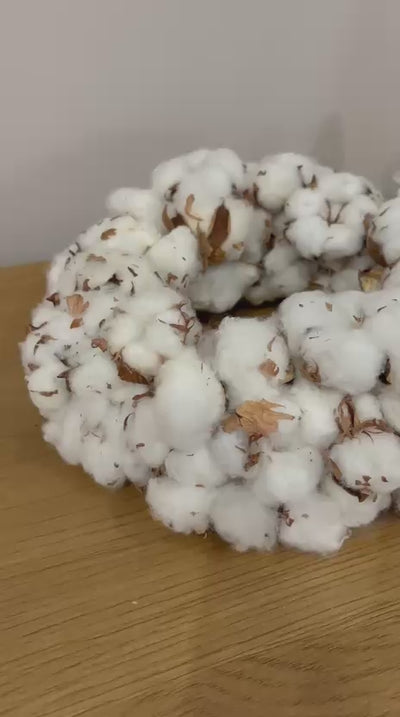 Der fluffig-weiche Baumwollkranz wird sorgfältig in Handarbeit auf einem stabilen Strohrömer befestigt. Dadurch erhält er seine harmonische Form und bleibt dauerhaft schön – ideal als nachhaltige Naturdeko für Wohnzimmer, Flur oder Schlafzimmer.