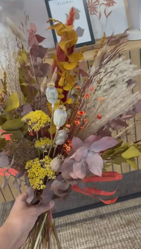 - Palm spears terracotta, pampas grass brown, eucalyptus, Glixia, Phalaris, Lagurus, lavender, poppy capsules, Archillea, Broom Bloom, pampas grass mini