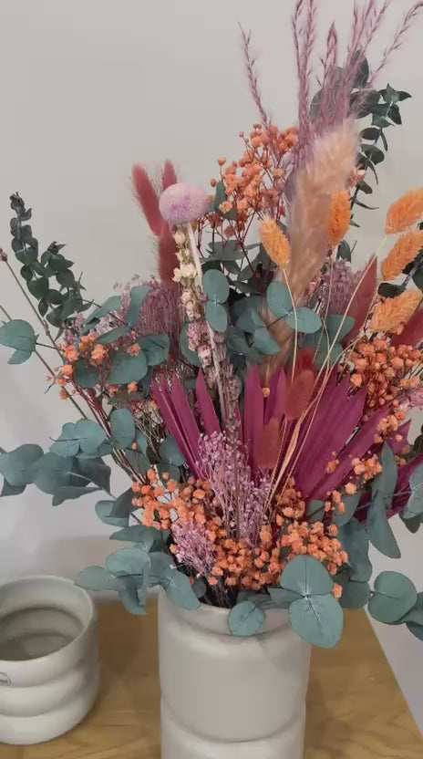 Inhalt: Palmblatt, Eukalyptus Cinerea, Federgras, Pampasgras Mini, Glixia, Craspedia, Lagurus, Phalaris, Eukalyptus Baby, Broom Bloom