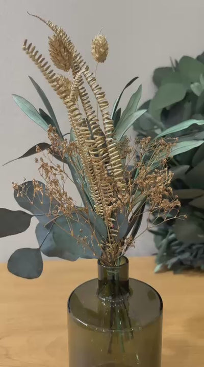 - Dried flowers: Eucalyptus, Glixia, Craspedia/Drumsticks, Lagurus, Ruscus