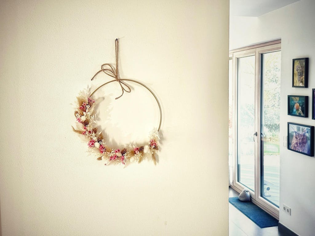 Der Trockenblumenkranz Blütenzauber ist ein absoluter Hingucker und verleiht deinem zu Hause ein echten WOW Effekt, egal ob als Wandkranz oder an einer Tür aufgehängt. Zarte rosa und beige Töne fügen sich elegant in dein zu Hause ein. Der wahrscheinlich dezenteste Trockenblumenkranz im Sortiment.