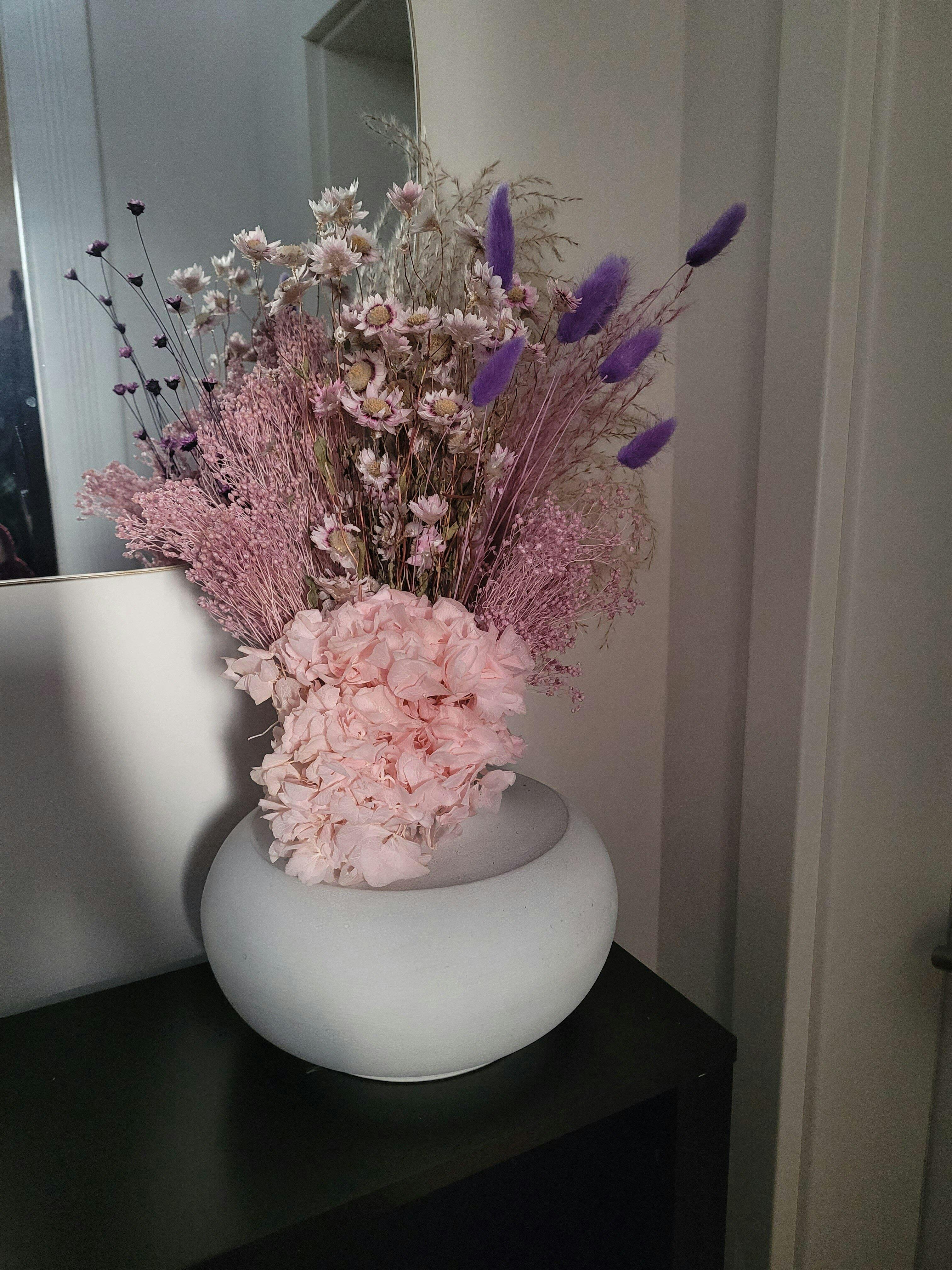- Blumen: Glixia Flieder, Hortensie rose, Broom Bloom lila, Rhodante rosa, Lagurus lila, Pampasgras Federgras rose