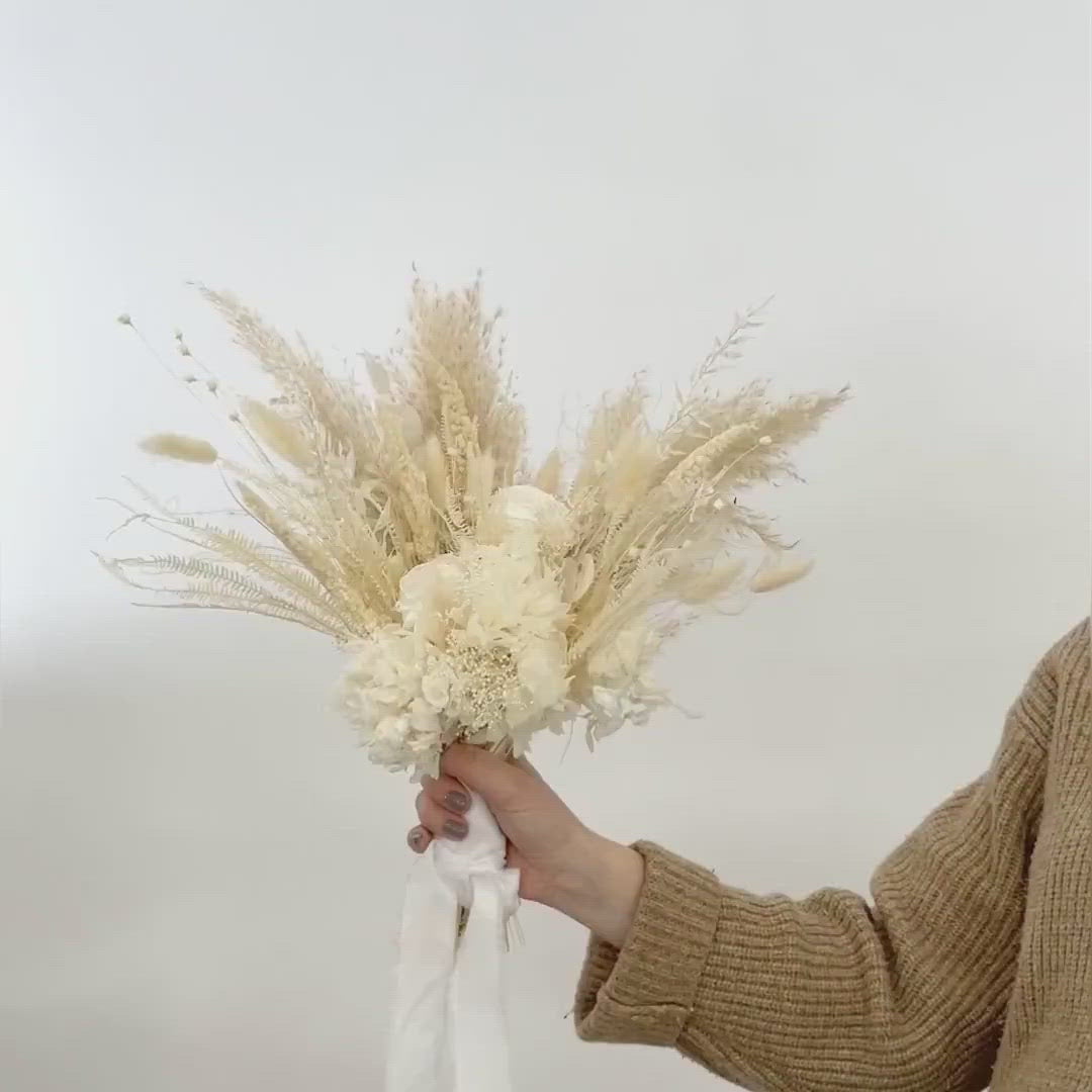 Unser Brautstrauß aus Trockenblumen in sanften Naturtönen verkörpert die zeitlose Schönheit einer romantischen Hochzeit. Er besticht durch die zauberhafte Präsenz von Hortensien und konservierten/gefriergetrockneten Rosen als strahlendem Zentrum.