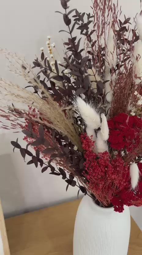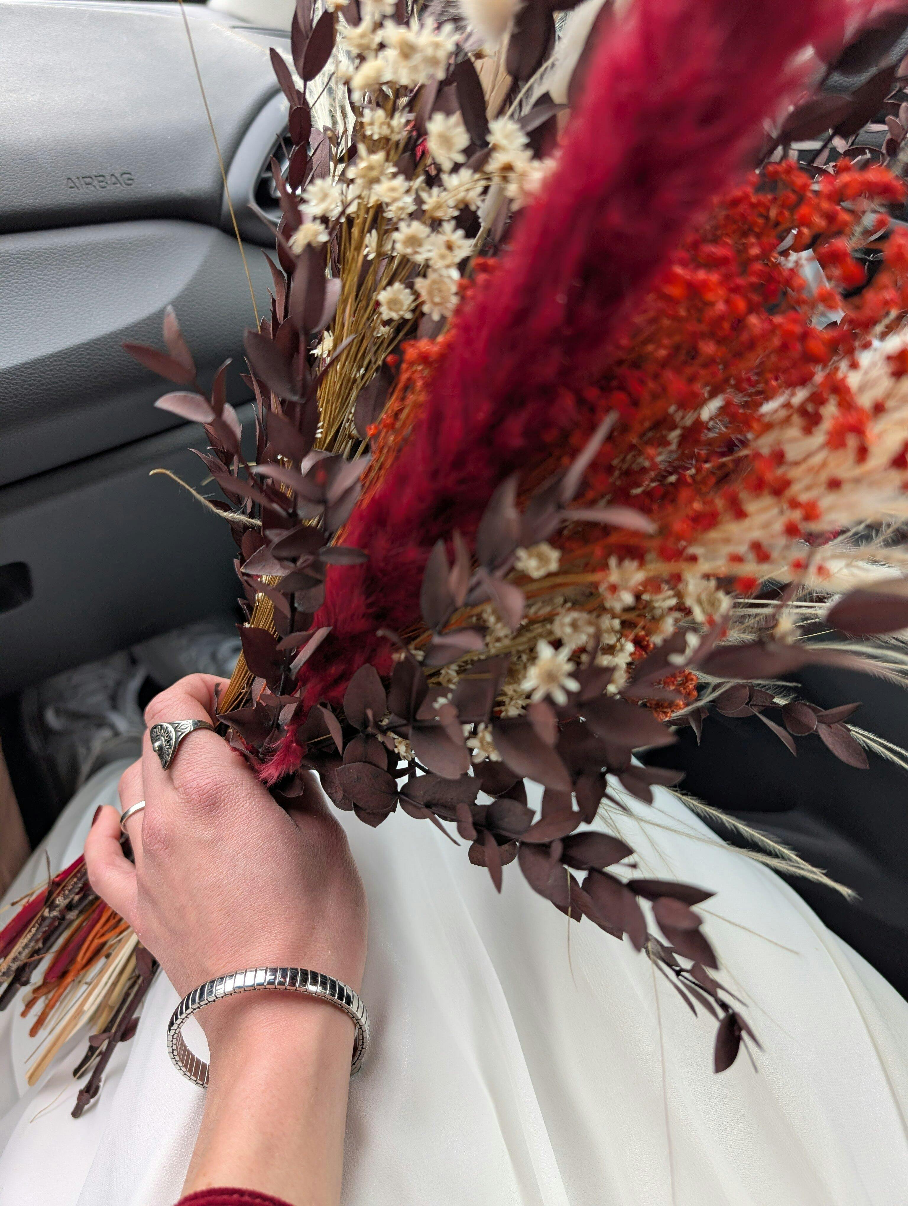 Herbstlicher Trockenblumenstrauß Bordeaux-Weiß