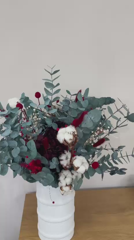 Feine Baumwolle trifft auf duftenden Eukalyptus, sanften Lagurus und elegante Hortensien – ergänzt durch festliche Akzente aus Craspedia, Glixia und Flachs.