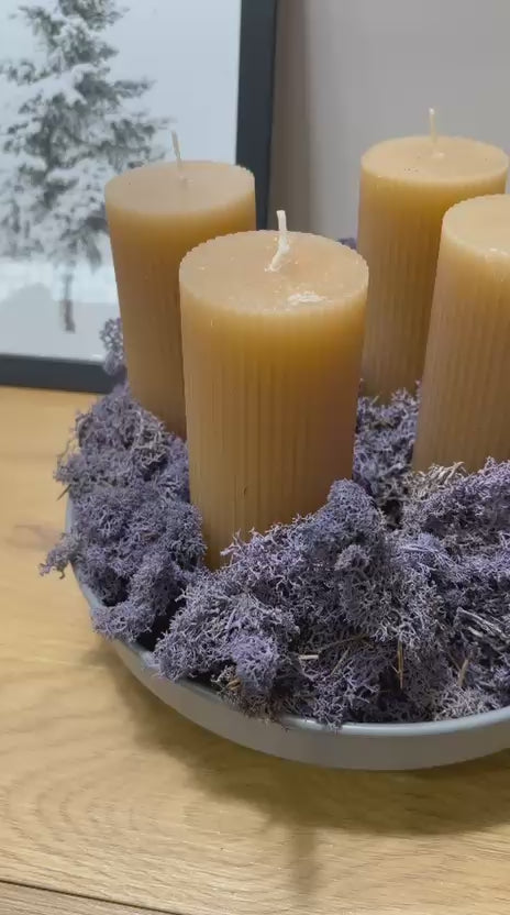 Das lilafarbene Rentiermoos setzt einen edlen, natürlichen Farbakzent und erinnert an winterliche Landschaften in der Dämmerung – kühl, ruhig und doch voller Stimmung. Gemeinsam entsteht ein harmonisches Gesamtbild, das perfekt in moderne, nordisch inspirierte Wohnräume passt.