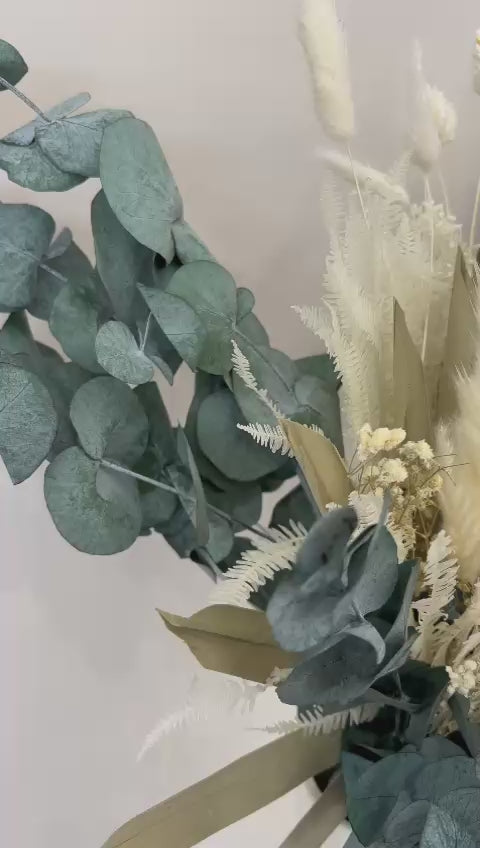 - Palmblatt, Eukalyptus, Pampasgras, Craspedia, Schleierkraut, Farn, Lagurus (Samtgras)