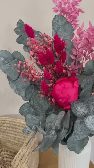 Pinkes Herz ist ein ausdrucksstarker Trockenblumenstrauß mit sanfter Leichtigkeit. Eukalyptus Cineria bildet die ruhige Basis, ergänzt durch rosa Ruskus, feines Schleierkraut und pinke Phalaris. Im Mittelpunkt steht eine pinke, konservierte Pfingstrose – als klares Highlight und namensgebendes Herz des Straußes.