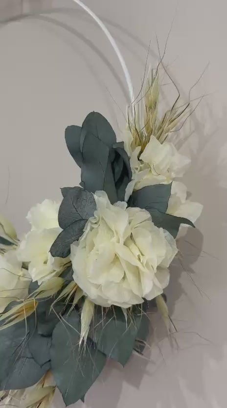 Der Trockenblumenkranz mit stabilisierten Hortensien und Eukalyptus ist ein absoluter Hingucker und verleiht deinem zu Hause ein echten WOW Effekt
